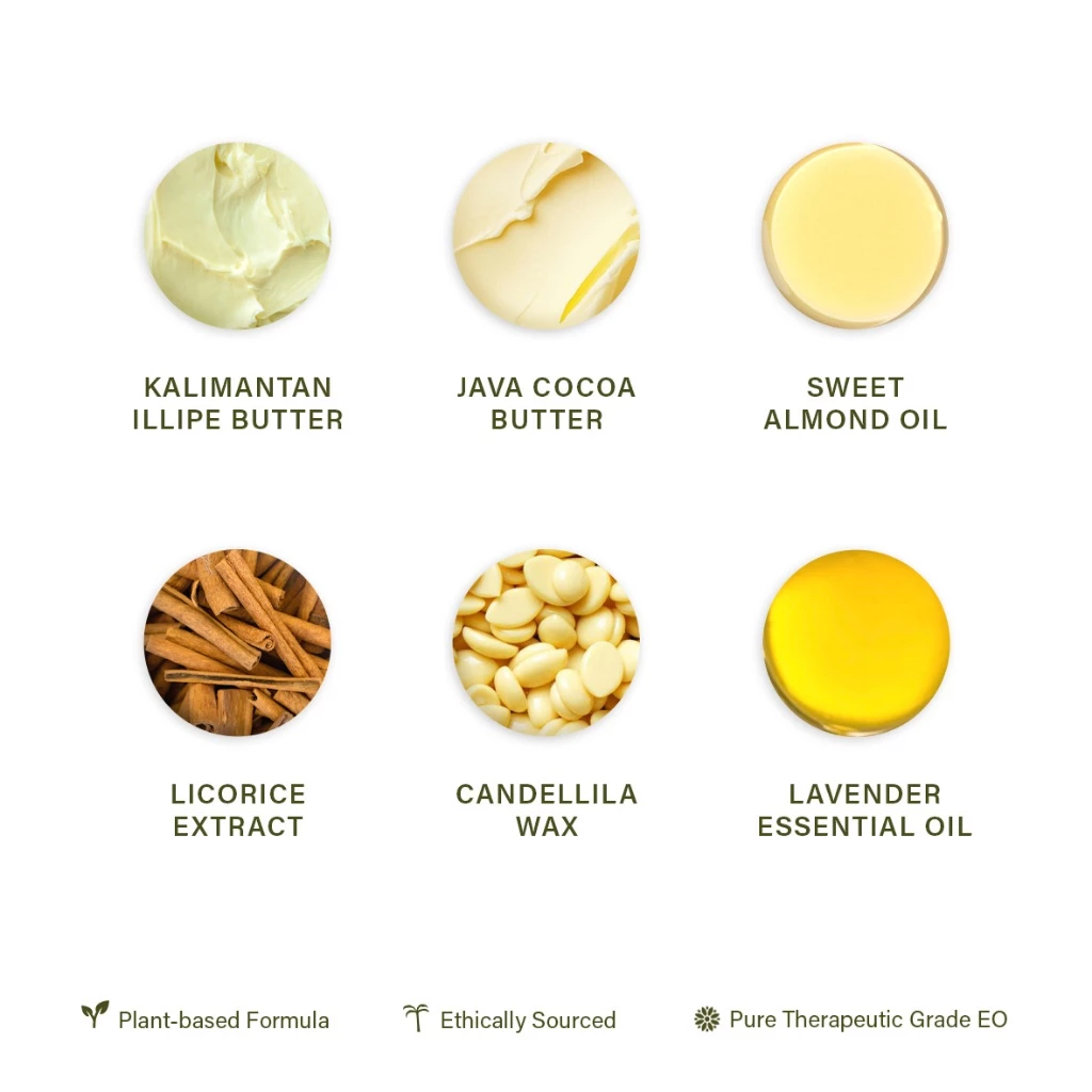 Kombinasi 6% Candelilla Wax dan Lavender Essential Oil menjaga hidrasi dan menenangkan kulit sensitif yang teriritasi.